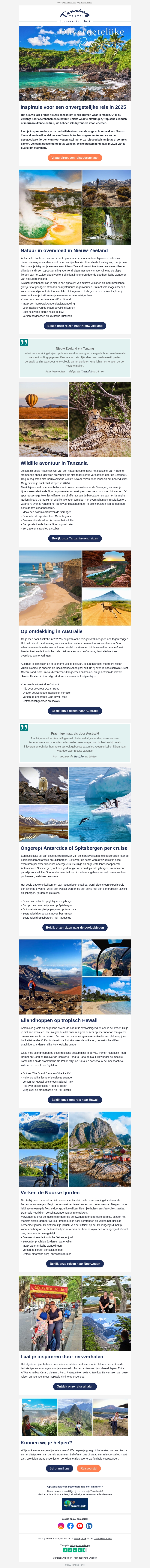 Laat je inspireren door zes onvergetelijke reizen die je absoluut aan je bucketlist wilt toevoegen. Van de wilde natuur in Nieuw-Zeeland tot de prachtige fjorden in Noorwegen, er is voor elk wat wils. Ontdek het avontuur van een Australische roadtrip of kies voor de exotische eilanden van Hawaï. Mis de kans niet om de schoonheid van onze aarde te ervaren zoals nooit tevoren. Bekijk de volledige reisaanbiedingen en pak je kans om te gaan waar je altijd al van gedroomd hebt.