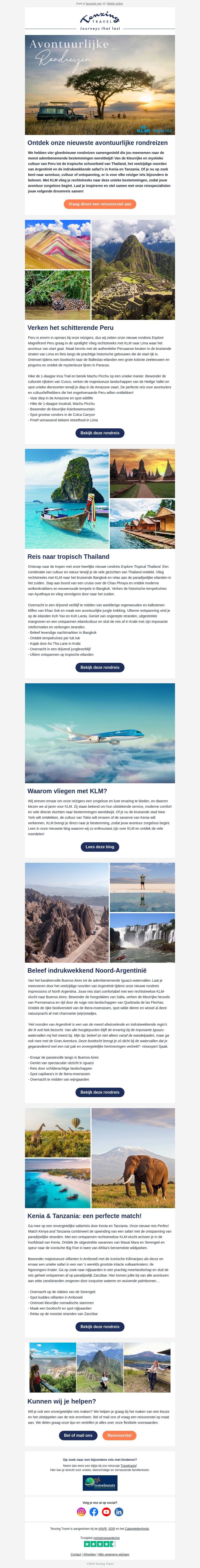 Verken inspirerende bestemmingen zoals Peru, Thailand, en Noord-Argentinië. Onze rondreizen bieden unieke ervaringen die je meenemen naar de meest adembenemende plekken op aarde. Laat je verrassen door het avontuur dat op je wacht en maak herinneringen die een leven lang meegaan. Lees waarom je voor KLM moet kiezen als je op reis gaat. Vergeet niet om ook naar Kenia en Tanzania te kijken voor een perfecte match!