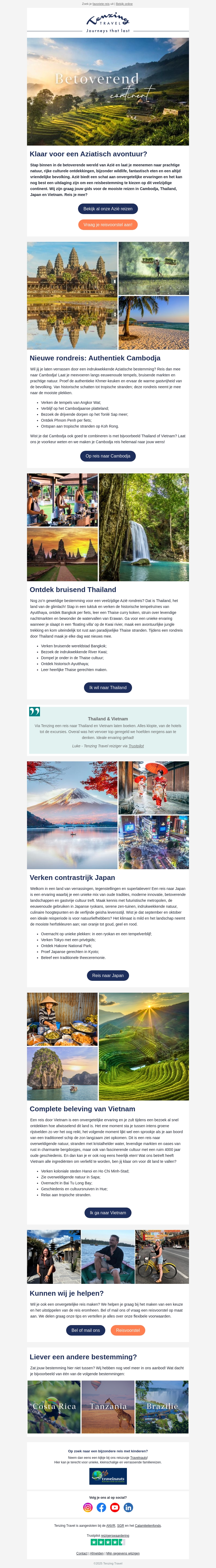 Laat je meevoeren naar de meest betoverende Aziatische bestemmingen. Reis door de cultuur en natuur van Cambodja, Thailand, Vietnam en Japan. Bezoek majestueuze tempels, levendige steden en serene landschappen met onze speciaal samengestelde reizen.