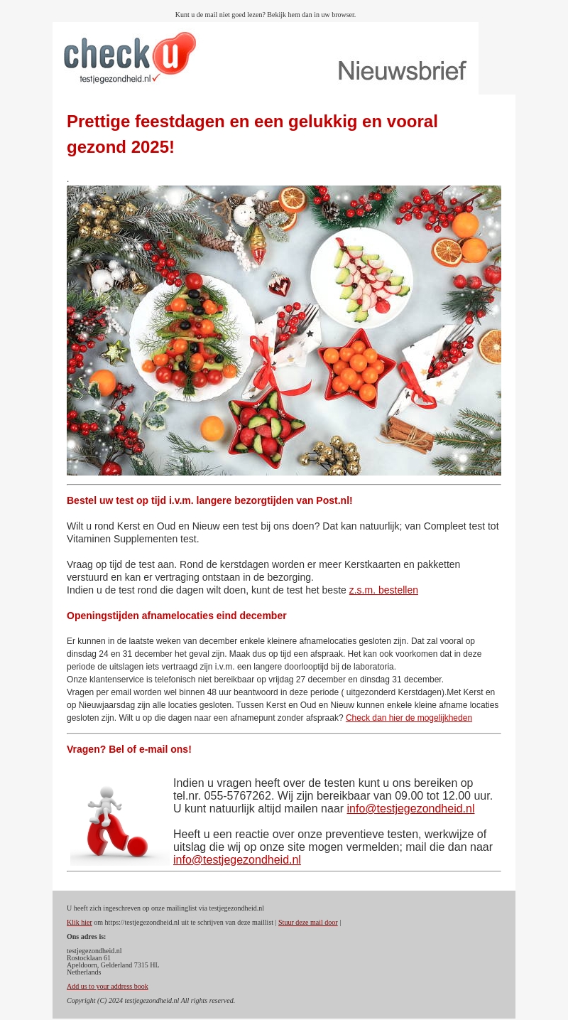 Deze nieuwsbrief van Testjegezondheid.nl biedt informatie over het laten uitvoeren van testen voor Kerst en Nieuwjaar. Van vitamine- en supplemententests tot praktische tips voor het plannen van afspraken vanwege langere bezorgtijden. Er zijn ook details over speciale openingstijden van afnamelocaties en contactinformatie voor vragen.