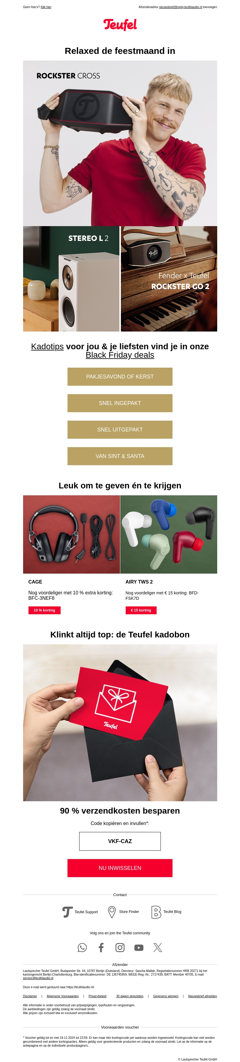 Verwen jezelf of je geliefden met de nieuwste Teufel audio-apparatuur. Ontdek onze speciale Black Friday deals voor unieke cadeautips. Profiteer van hoge kortingen op topkwaliteit producten zoals de ROCKSTER CROSS en AIRY TWS 2. Gebruik onze exclusieve kortingscodes voor extra voordeel. Shop nu en bespaar 90% op de verzendkosten met onze speciale code.