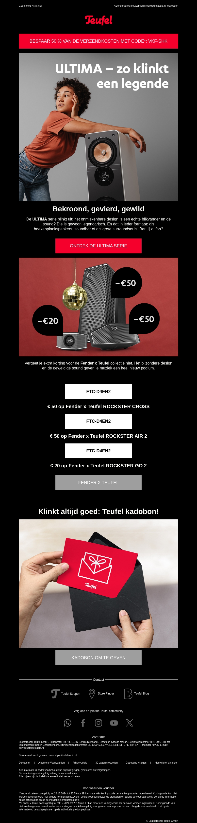 De ULTIMA serie van Teufel biedt een ongeëvenaarde geluidservaring. Met zijn iconische design en krachtige sound is deze lijn een favoriet onder muziekliefhebbers. Ontdek de veelzijdigheid in verschillende formaten, van boekenplankspeakers tot uitgebreide surroundsets. Profiteer nu van extra korting met speciale kortingscodess en maak kennis met het bijzondere design van de Fender x Teufel collectie.