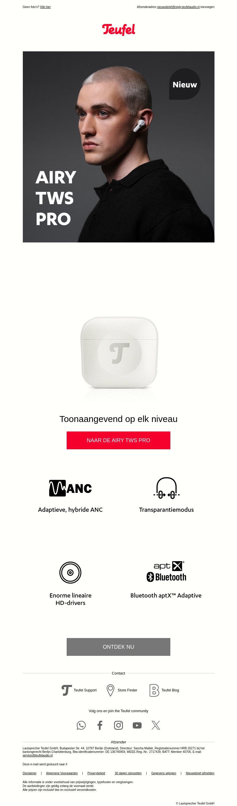 De AIRY TWS PRO zijn nu beschikbaar! Deze oordopjes combineren adaptieve hybride ANC met transparantiemodus voor een meeslepende luisterervaring. Geniet van krachtige HD-drivers en Bluetooth aptX™ Adaptive. Ontdek hoe deze innovatieve technologie je muziekbeleving naar een nieuw niveau tilt.
