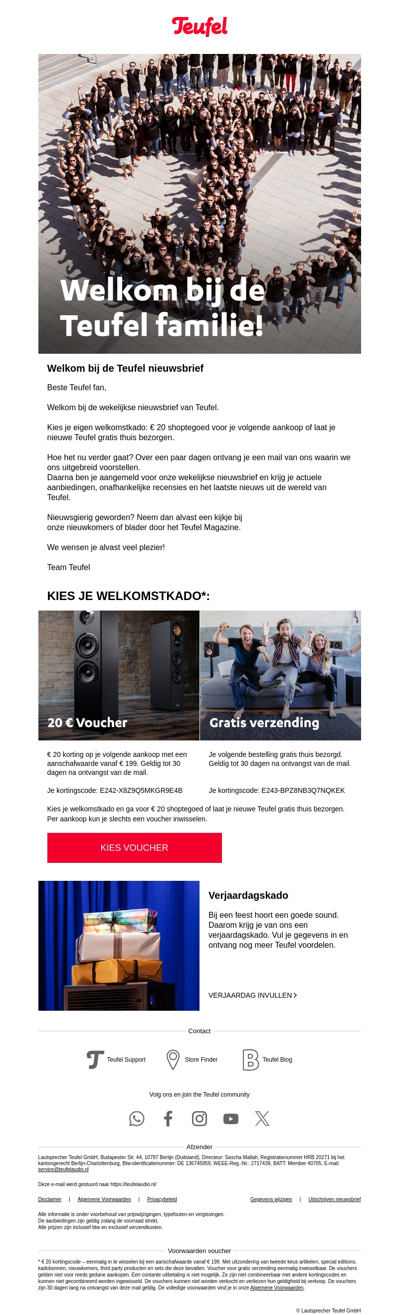 Beste Teufel fan, welkom bij de wekelijkse nieuwsbrief van Teufel. Kies je eigen welkomstcadeau zoals een € 20 shoptegoed of gratis verzending. Blijf op de hoogte van de nieuwste aanbiedingen, onafhankelijke recensies en het laatste nieuws uit de wereld van Teufel.