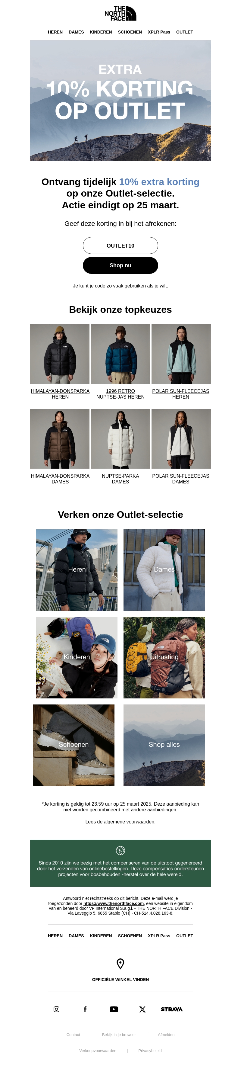 Scoor nu 10% extra korting op de Outlet-selectie van The North Face. Deze aanbieding biedt topkeuzes voor zowel heren als dames, inclusief jassen en nog veel meer. De actie is geldig tot 25 maart, dus mis de kans niet om je favoriete items met korting te shoppen. Gebruik de code OUTLET10 bij het afrekenen. Shop nu online en ontdek onze uitgebreide collectie.