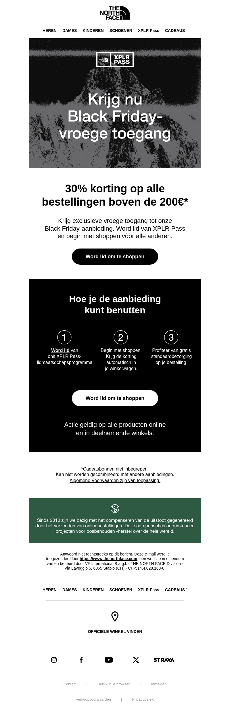 Krijg nu exclusieve vroege toegang tot de Black Friday-aanbieding van The North Face. Bespaar 30% op alle bestellingen boven de €200. Word lid van het XPLR Pass lidmaatschapsprogramma en geniet van extra voordelen, inclusief gratis standaardverzending. Deze aanbieding geldt zowel online als in deelnemende winkels. Cadeaubonnen zijn uitgesloten van deze actie.