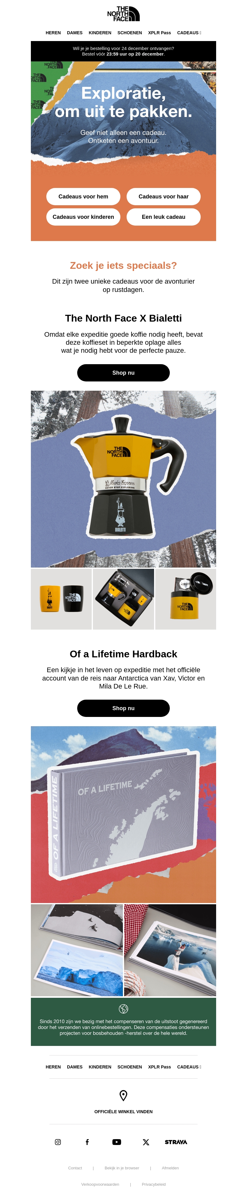 Ben je op zoek naar iets speciaals voor de avonturier in je leven? Ontdek onze exclusieve cadeaus voor hem, haar, en kinderen, zoals de The North Face X Bialetti koffieset en de ‘Of a Lifetime’ hardback boek. Geef meer dan alleen een cadeau, geef een avontuur.