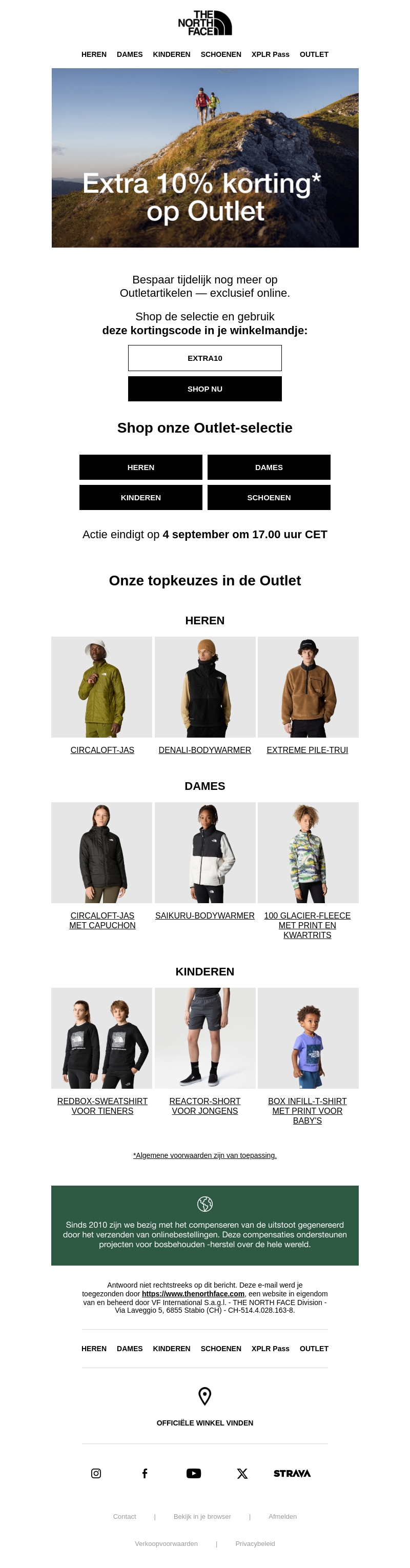 Ontvang tijdelijk extra 10% korting op outletartikelen bij The North Face. Geldig alleen online tot 4 september om 17.00 uur CET. Gebruik de kortingscode EXTRA10 bij de kassa. Mis niet onze topkeuzes voor heren, dames en kinderen in de outlet sectie.