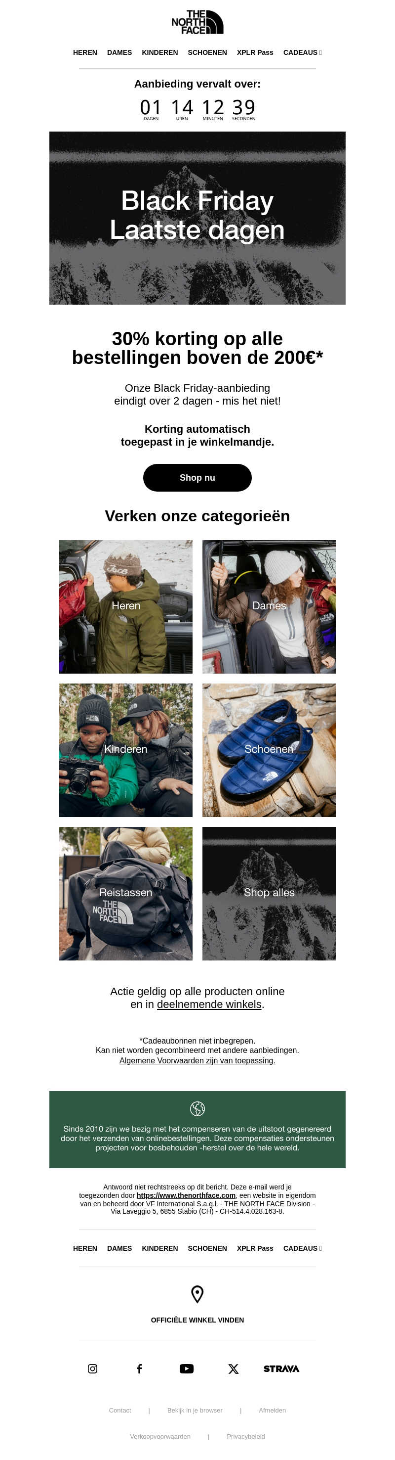 De tijd dringt! Nog slechts 1 dag om te profiteren van onze Black Friday-aanbiedingen. Ontvang 30% korting op bestellingen boven de 200€. De korting wordt automatisch in je winkelmand toegepast. Verken verschillende categorieën zoals heren, dames, en kinderen.