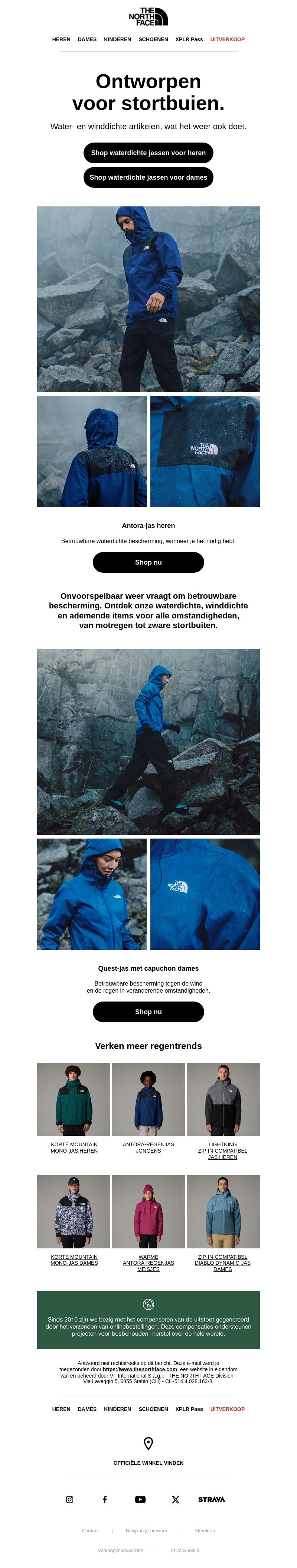 The North Face introduceert zijn nieuwste collectie water- en winddichte regenkleding. Bescherming tegen onvoorspelbaar weer met stijlvolle en functionele jassen. Shop nu de waterdichte jassen voor zowel heren als dames en blijf droog tijdens stortbuien. Deze collectie biedt duurzame oplossingen voor regenachtige dagen. Ontdek de nieuwste stijlen en blijf comfortabel in elke situatie.