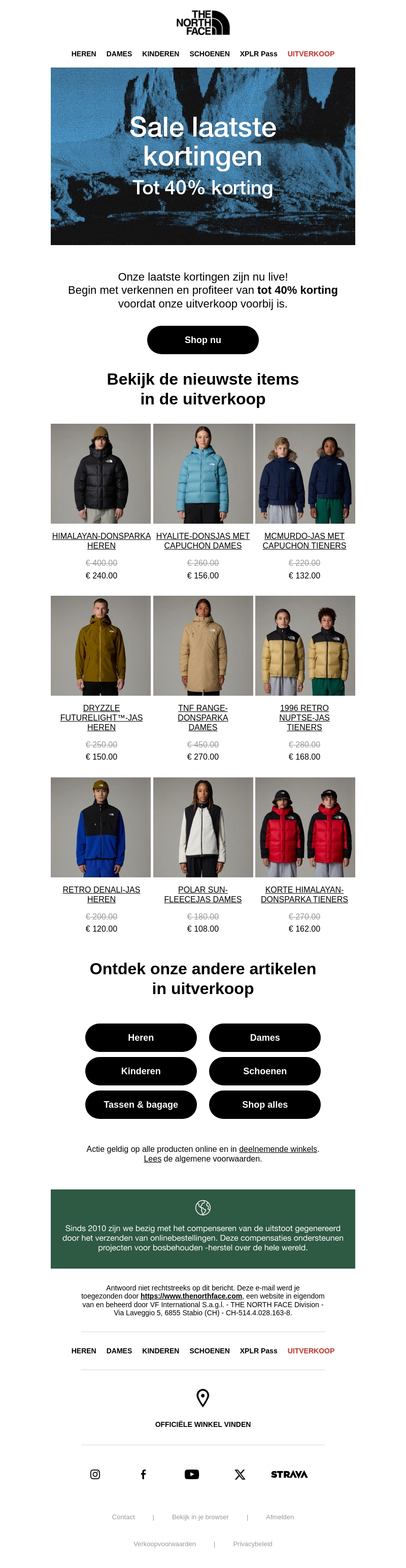 Ontdek de nieuwste kortingen bij The North Face, met besparingen tot 40% op een breed scala aan jassen voor heren, dames en kinderen. Profiteer van de uitverkoop voordat de voorraad op is. Shop nu jouw favoriete items en geniet van hoogwaardige kleding tegen ongelooflijke prijzen.