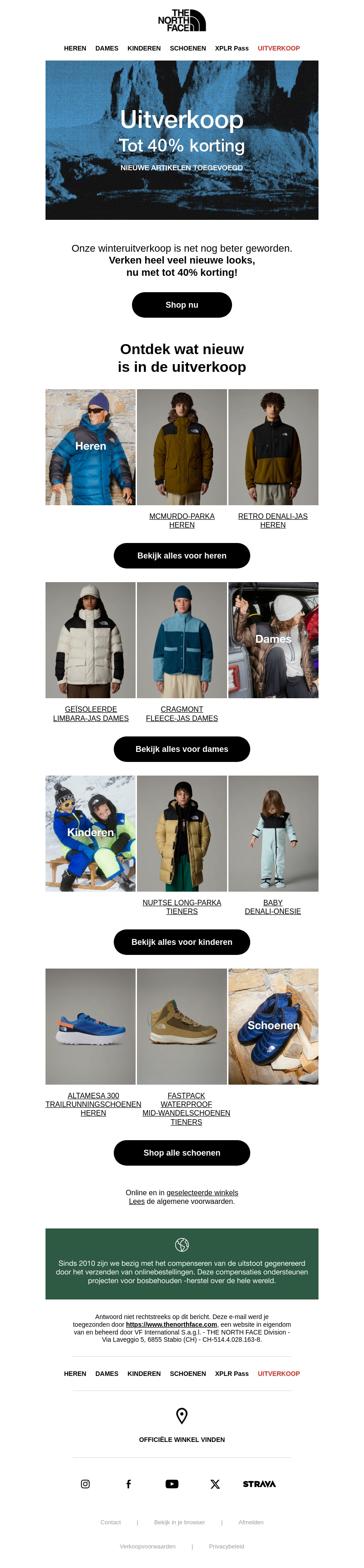 De winteruitverkoop is hier met ongelooflijke kortingen tot wel 40%! Ontdek een breed scala aan nieuwe producten voor heren, dames, kinderen en schoenen. Of je nu op zoek bent naar een warme parka of comfortabele schoenen, je vindt het allemaal in onze uitverkoop. Winkel nu en vernieuw je garderobe met hoogwaardige items. Deze aanbiedingen gelden zowel online als in geselecteerde winkels.