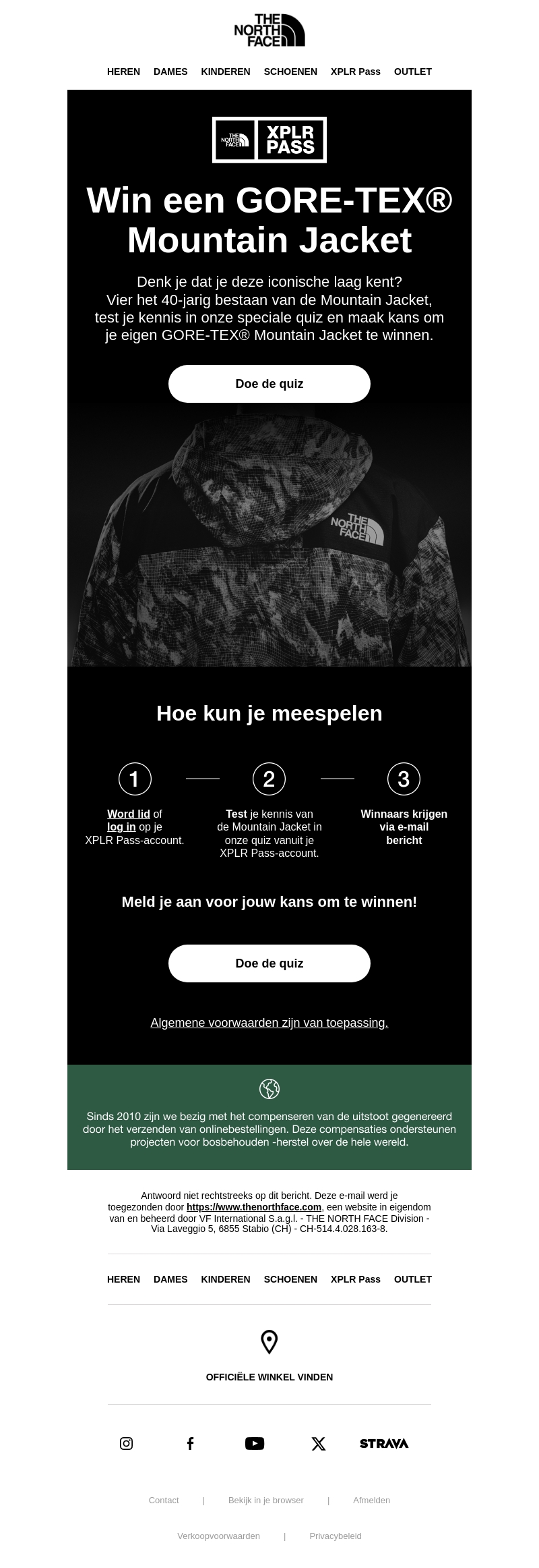 Vier het 40-jarig bestaan van de Mountain Jacket met The North Face. Doe mee aan de speciale quiz en win je eigen GORE-TEX® Mountain Jacket. Meld je aan of log in op je XPLR Pass-account om deel te nemen. Test je kennis en maak kans op deze iconische laag voor avontuur. De winnaars worden via e-mail op de hoogte gebracht.