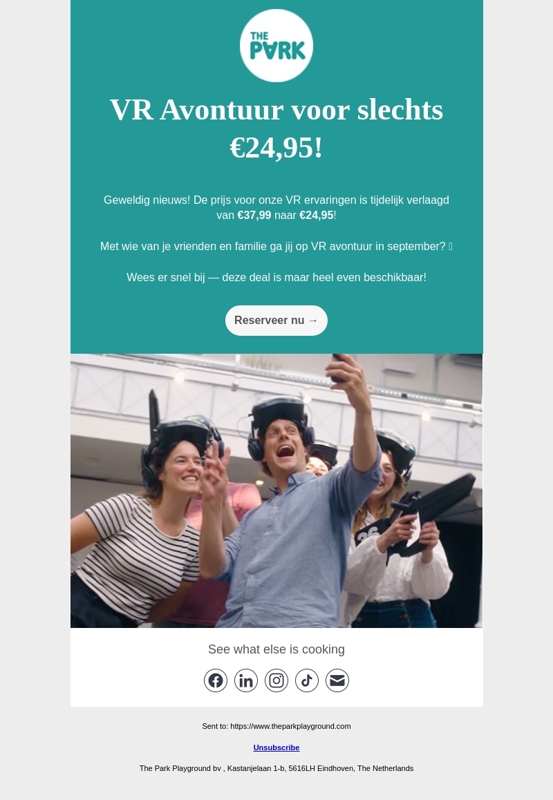 Geweldig nieuws! De prijs voor onze VR ervaringen is tijdelijk verlaagd van €37,99 naar €24,95. Met wie van je vrienden en familie ga jij op VR avontuur in september? Wees er snel bij - deze deal is maar heel even beschikbaar! Reserveer nu en beleef een onvergetelijk avontuur.