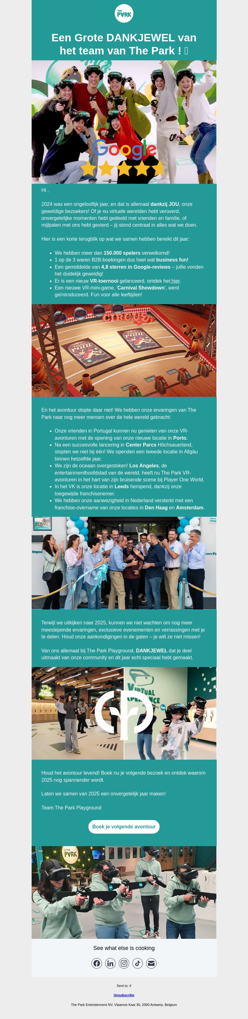 2024 was een jaar vol avontuur bij The Park, en dat allemaal dankzij jullie! Ontdek nieuwe VR-ervaringen, prijzen en internationale uitbreidingen. We kijken uit naar 2025 met nóg meer spannende avonturen. Bedankt voor jullie steun en enthousiasme!