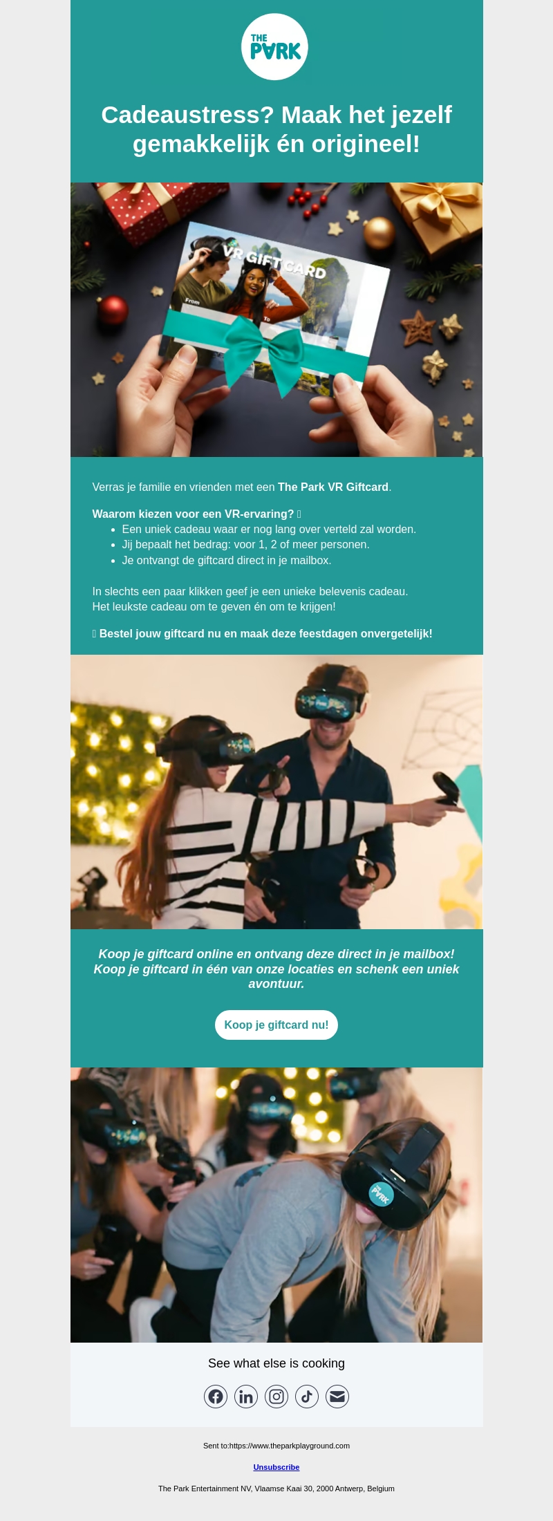 Ervaar cadeauvreugde zonder stress met de The Park VR Giftcard! Geef je vrienden en familie een uniek VR-avontuur. Kies je bedrag en ontvang de giftcard direct in je mailbox. Perfect voor één, twee of meer personen. Bestel nu en maak deze feestdagen onvergetelijk!