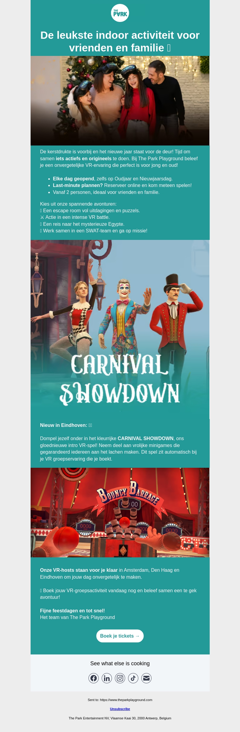 De feestdagen zijn voorbij, ontdek een unieke VR-ervaring bij The Park Playground. Geniet van spannende avonturen zoals escape rooms en VR battles. Ontsnap aan de realiteit en beleef het nieuwste intro VR-spel, CARNIVAL SHOWDOWN, in Eindhoven. Boek vandaag nog je onvergetelijke groepsactiviteit in Amsterdam, Den Haag of Eindhoven.