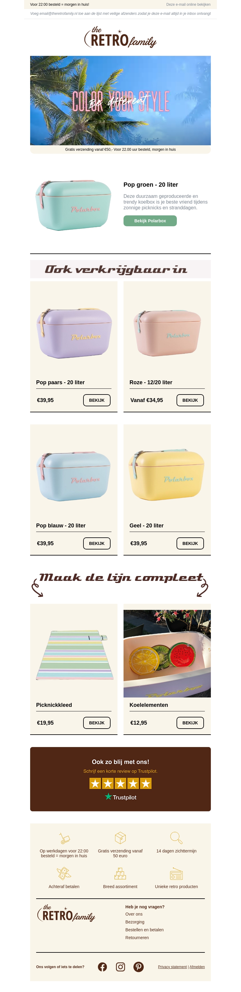 Houd je drankjes en snacks koel tijdens zonnige picknicks en stranduitjes met de stijlvolle koelboxen van RetroFamily. Verkrijgbaar in verschillende trendy kleuren zoals groen, paars, roze, blauw en geel. Profiteer van gratis verzending vanaf €50 en snelle levering. Maak je zomer compleet met een picknickkleed en koelelementen.