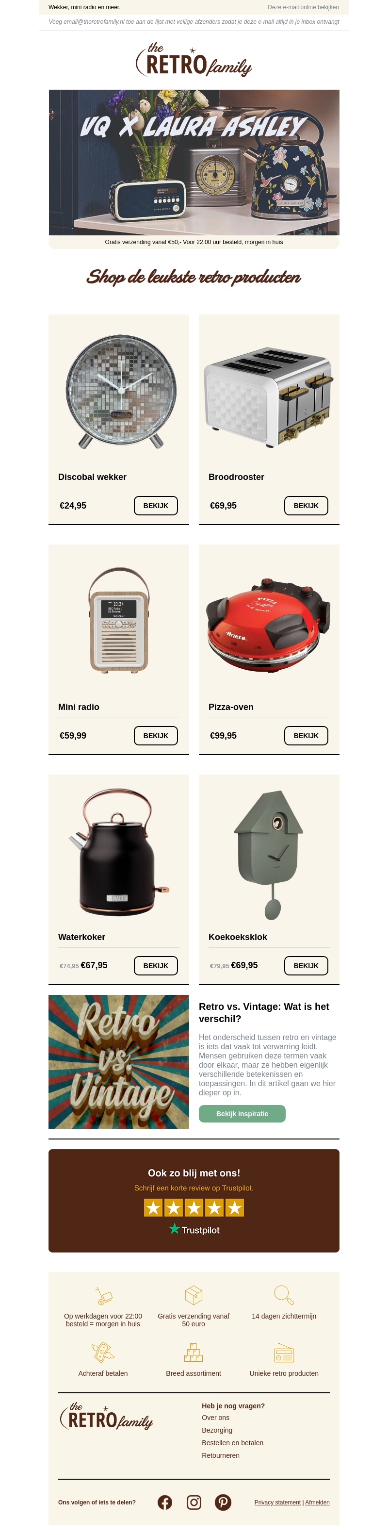 Ben je op zoek naar unieke retroproducten? The Retro Family heeft een geweldige selectie! Van discobalwekkers tot broodroosters en mini radio's, wij hebben alles. Profiteer nu van gratis verzending bij bestellingen vanaf €50!