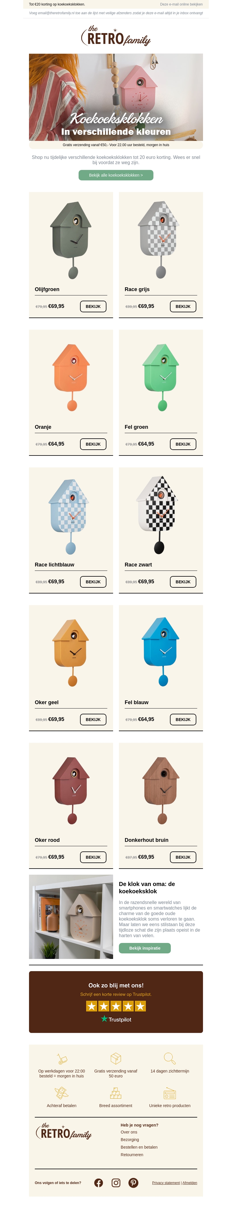 Bekijk onze nieuwe collectie koekoeksklokken in verschillende kleuren met een tijdelijke korting van €20. Gratis verzending vanaf €50 en vandaag besteld, morgen in huis. Wees er snel bij voordat de korting wegvliegt!