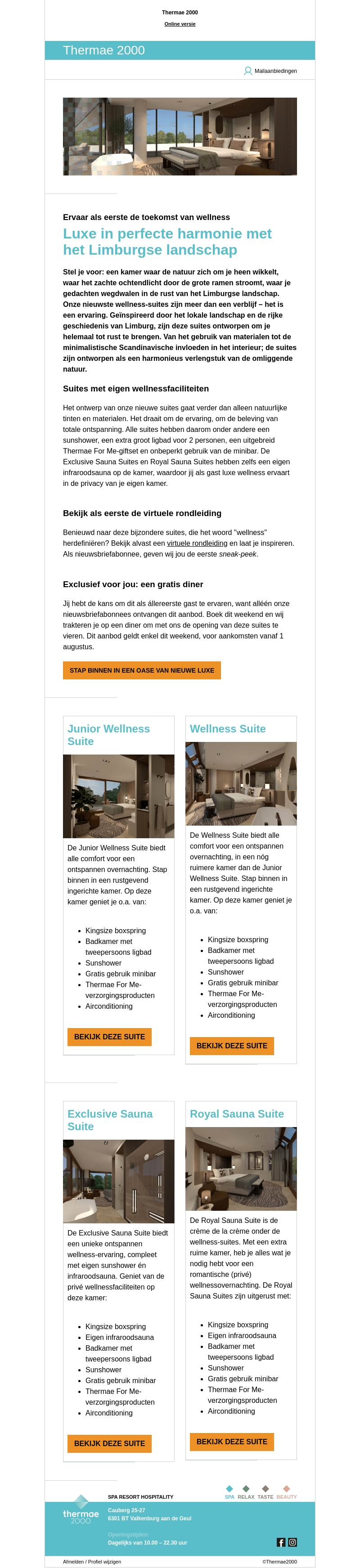 Ontsnap naar de serene wellness van Thermae 2000 met luxe suites in het hart van Limburg. Geniet van een exclusieve ervaring, waaronder sunshowers en privé-sauna's. Ontvang een gratis diner als nieuwsbriefabonnee en beleef een voorproefje van deze ontspanningsoase.