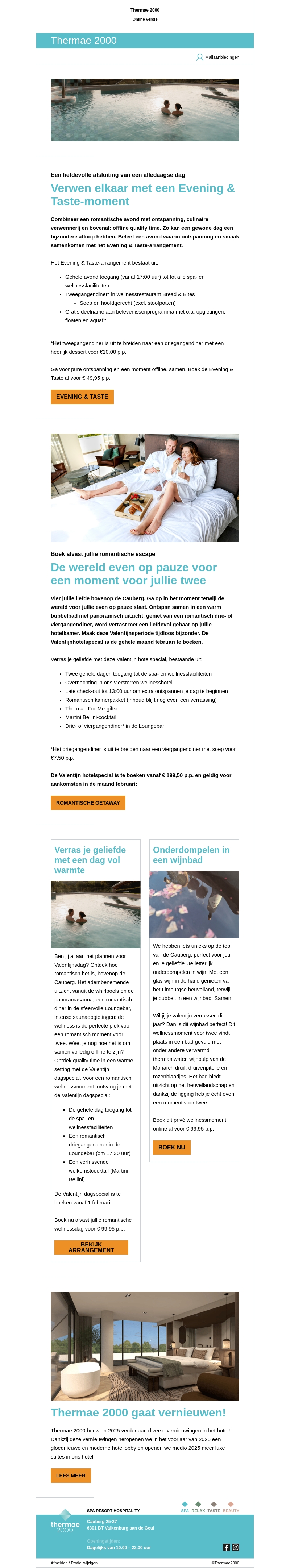 Beleef een onvergetelijke avond bij Thermae 2000 met het unieke Evening & Taste-arrangement. Geniet samen met je geliefde van ontspanning en culinaire hoogstandjes. Boek snel voor Valentijnsdag en ervaar een romantische ontsnapping bovenop de Cauberg.