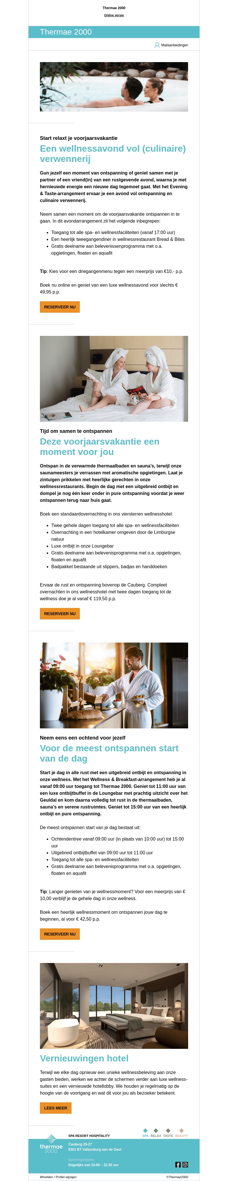 Beleef de voorjaarsvakantie vol ontspanning bij Thermae 2000. Geniet van weldadige thermale baden, sauna's en culinaire verrassingen. Verwen jezelf met een wellnessavond of een wellness & ontbijt arrangement. Ontdek onze vernieuwde hotelfaciliteiten en boek nu voor een bijzonder verblijf.
