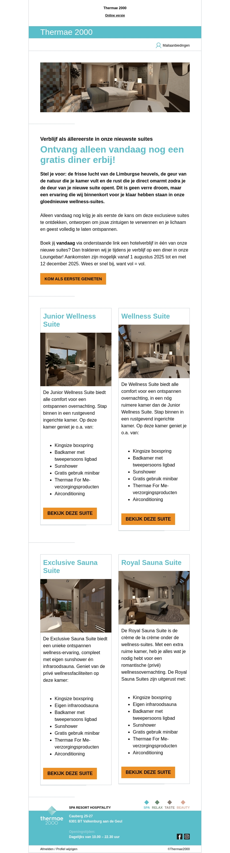 Blijf als eerste in onze nieuwste wellness-suites met een exclusief aanbod: slechts vandaag ontvang je tijdens je verblijf een gratis diner. Ervaar de frisse lucht van de Limburgse heuvels en ontspan volledig in onze suites, ontworpen om je zintuigen te verwennen. Boek nu, want vol = vol!