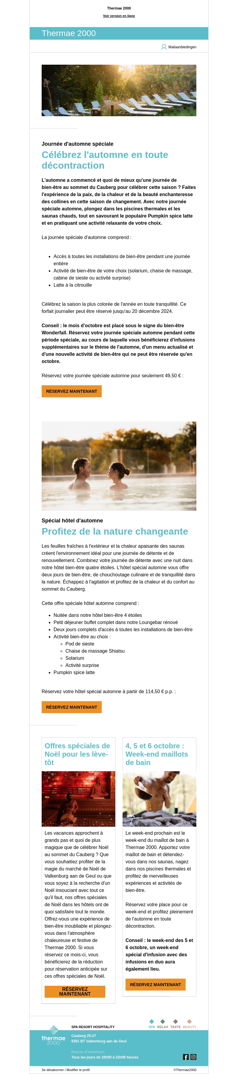 Duik in de herfst met Thermae 2000 en ontdek ontspannende wellnessarrangementen. Geniet van speciale herfstaanbiedingen die toegang bieden tot spa- en sauna-ervaringen. Boek nu en profiteer van de unieke sfeer en extra activiteiten, zoals pompoen latte en herfstthema's.