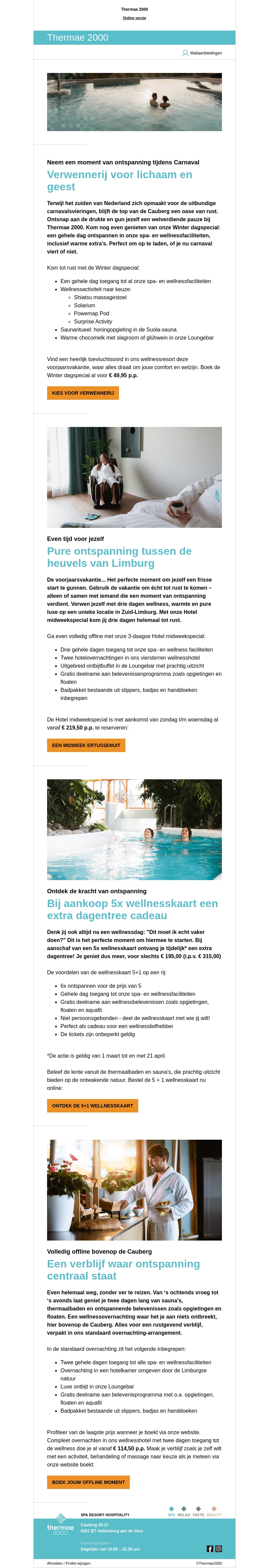Beleef pure ontspanning tijdens de voorjaarsvakantie bij Thermae 2000. Geniet van speciale wellnessdeals met verzachtende behandelingen en luxe faciliteiten. Ontvang een extra dagentree cadeau bij aankoop van een 5x wellnesskaart. Ervaar een verkwikkend verblijf en revitaliseer je lichaam en geest.