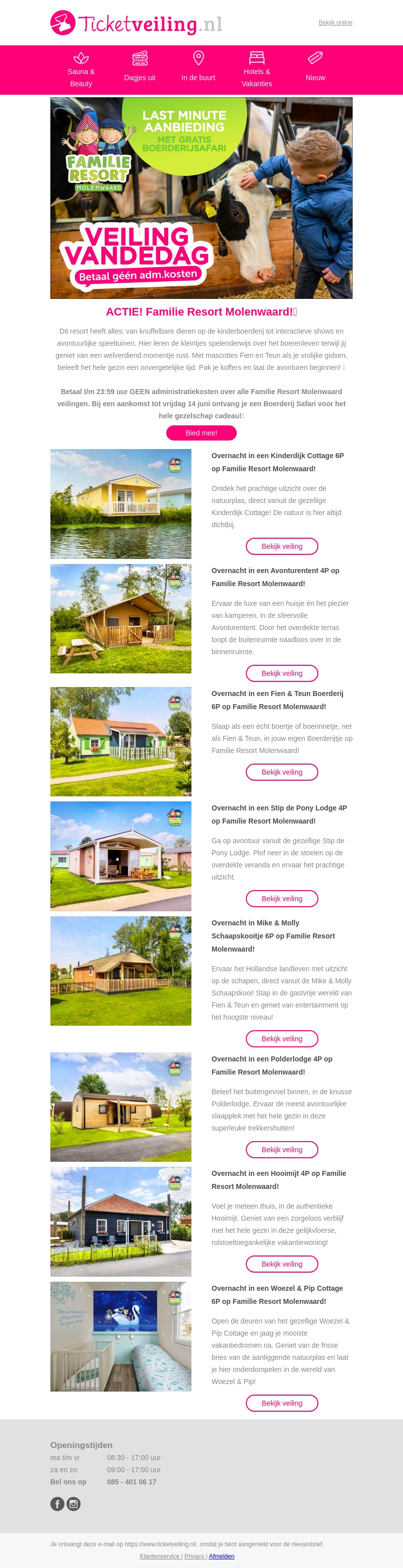 Bezoek Familie Resort Molenwaard voor een onvergetelijke vakantie! Geniet van een verblijf in de mooiste cottages, avontuur lodges, en nog veel meer. Ontvang een gratis boerderijsafari bij aankomst tot vrijdag 14 juni. Mis de veiling vandaag niet en bespaar op administratiekosten!