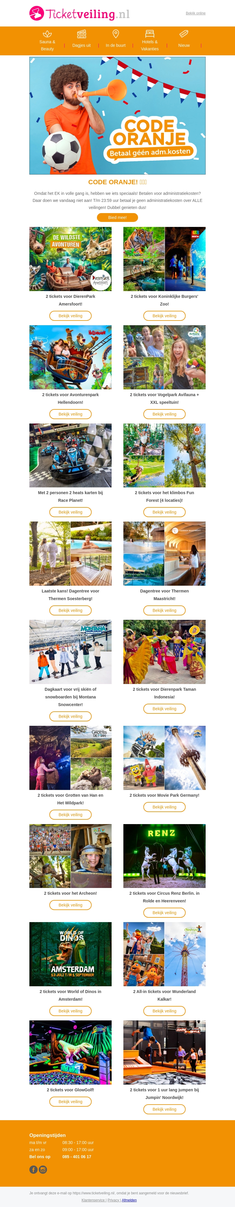 Ontdek de voordelen van CODE ORANJE bij Ticketveiling.nl! Betaal geen administratiekosten op alle veilingen totdat de actie eindigt. Geniet van geweldige deals zoals dierentuinkaarten, pretparkavonturen, wellnessdagen en meer. Mis deze speciale gelegenheid niet!