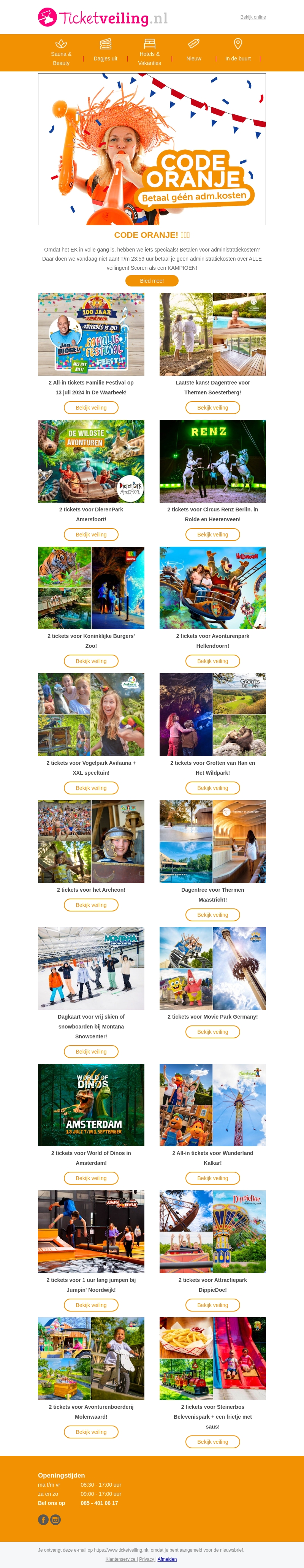 Het EK is in volle gang en Ticketveiling.nl viert mee met een speciale CODE ORANJE actie! Alleen vandaag betaal je geen administratiekosten op alle veilingen. Of je nu op zoek bent naar tickets voor een dierentuin, pretpark, festival of wellness resort, wij hebben het allemaal. Mis deze kans niet en bespaar op je favoriete uitjes!