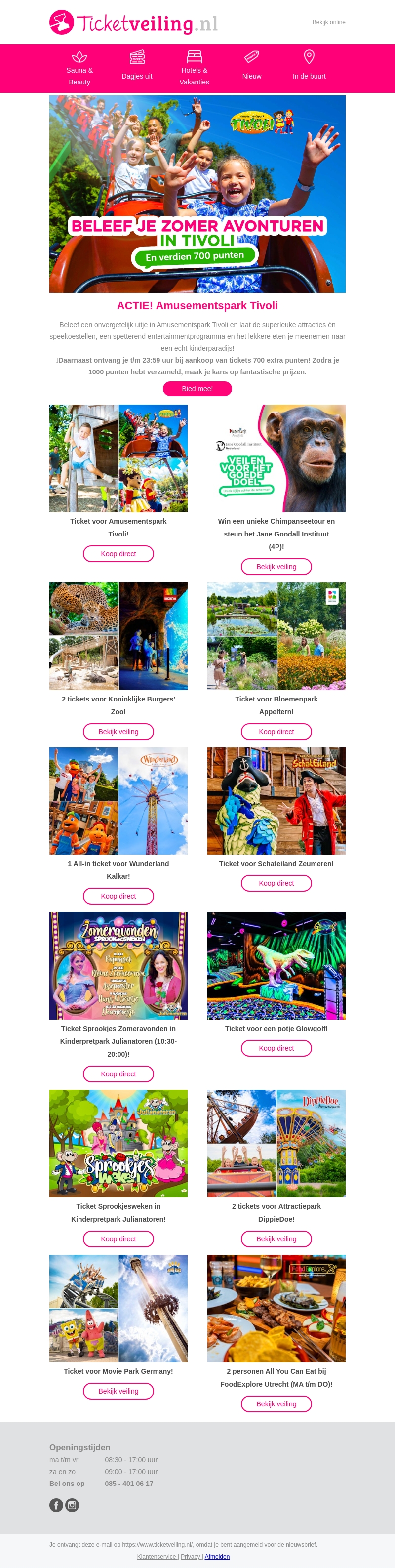 Beleef een fantastische dag in Amusementspark Tivoli met zijn spannende attracties en speeltoestellen. Ontvang bovendien 700 extra punten bij je aankoop vóór 23:59 uur. Mis het speciale vermaak- en entertainmentprogramma voor kinderen niet. Maak je zomer onvergetelijk met dit geweldige aanbod!