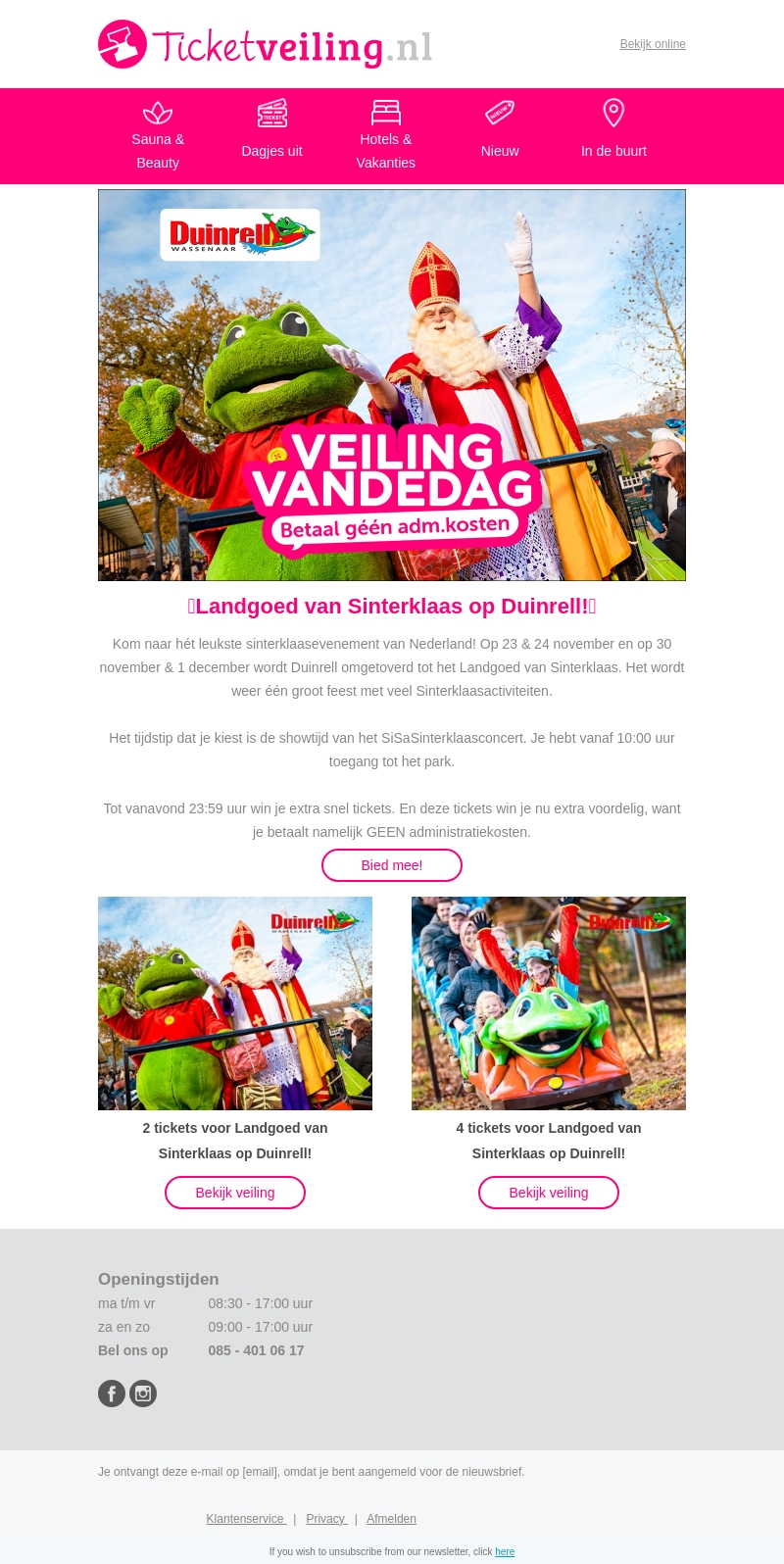 Kom naar het Landgoed van Sinterklaas in Duinrell! Beleef het leukste sinterklaasevenement van Nederland op 23 & 24 november en op 30 november & 1 december. Maak deel uit van een groot feest met veel Sinterklaasactiviteiten. Kies jouw tijdstip voor het SiSaSinterklaasconcert en geniet vanaf 10:00 uur van het park. Wacht niet langer en bied mee om extra snel tickets te winnen zonder administratieve kosten!