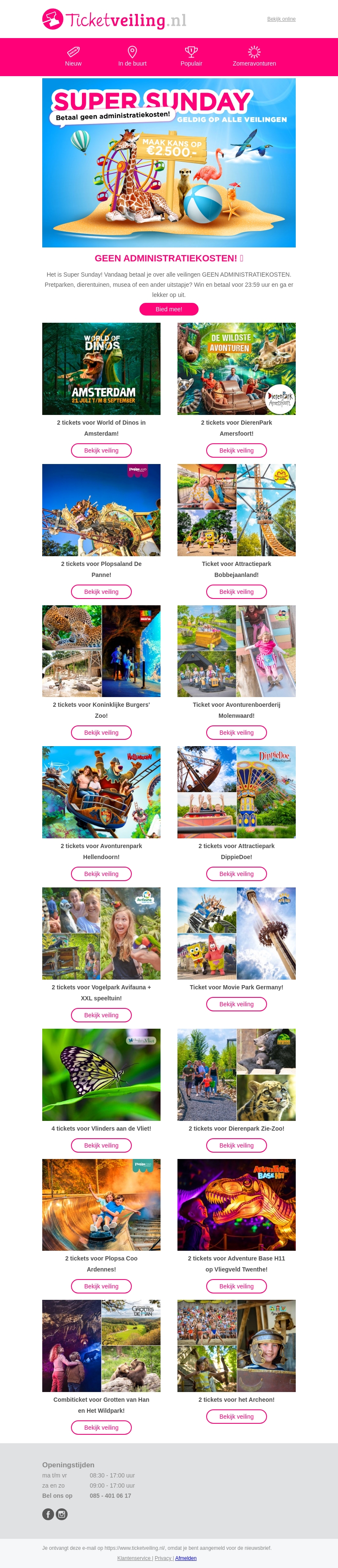 Het is weer Super Sunday bij Ticketveiling.nl! Dit betekent dat je vandaag kunt genieten van veilingen zonder administratiekosten. Of je nu naar een pretpark, dierentuin of museum wilt, er is voor ieder wat wils. Plaats je bieding en betaal voor 23:59 uur om te profiteren van deze actie. Mis het niet en beleef een onvergetelijke dag uit!