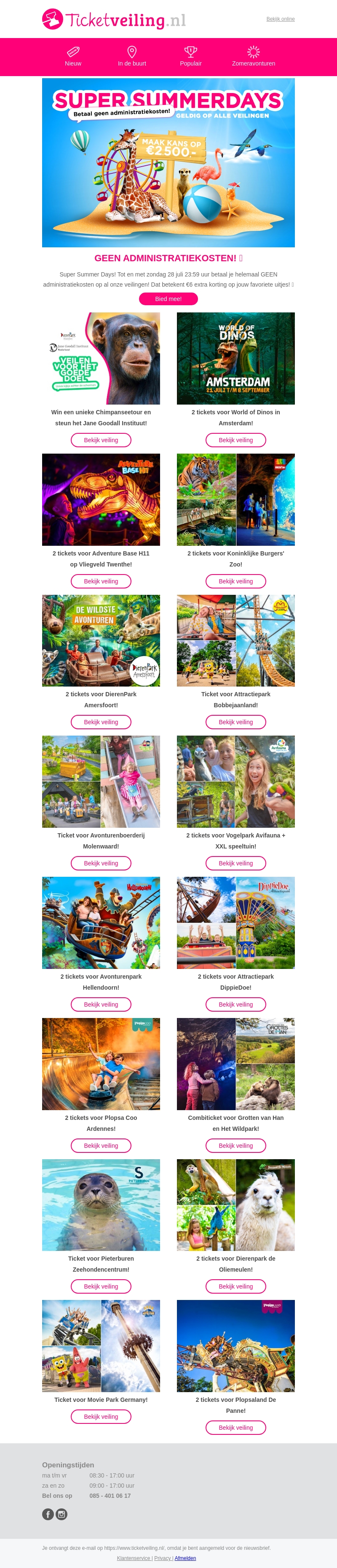 De Super Summer Days zijn hier! Tot en met zondag betaal je geen administratiekosten op alle veilingen. Ontdek geweldige aanbiedingen en maak kans op fantastische prijzen, zoals een unieke chimpansee-tour, tickets voor parken en avonturen, en nog veel meer.