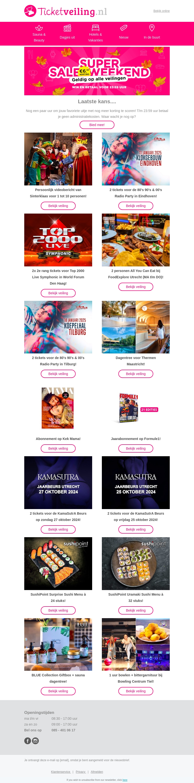 Laatste kans om jouw favoriete dagje uit of vakantie te boeken zonder administratiekosten. Geniet van een Super Sale Weekend met kortingen op alle veilingen. Mis deze kans niet en bied mee voor geweldige deals op sauna's, beauty, hotels en meer.