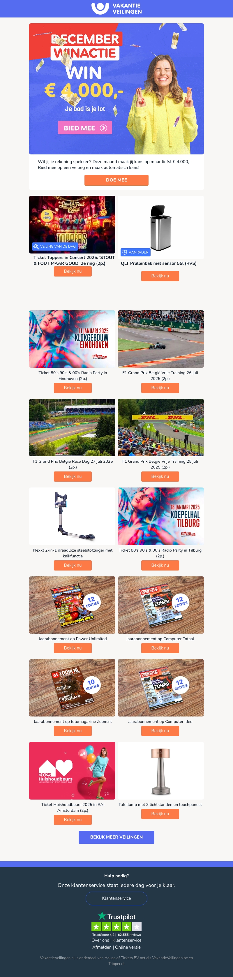 Vakantie Veilingen biedt je de kans om deze maand €4.000 te winnen. Je bod is je lot, dus mis deze unieke kans niet. Doe mee aan de spannende veilingen en vergroot je kansen. Daarnaast kun je ook geweldige deals scoren op concerttickets, huishoudelijke producten en meer. Bekijk snel de aanbiedingen en veilingmogelijkheden. Aarzel niet en bied nu mee om te winnen!