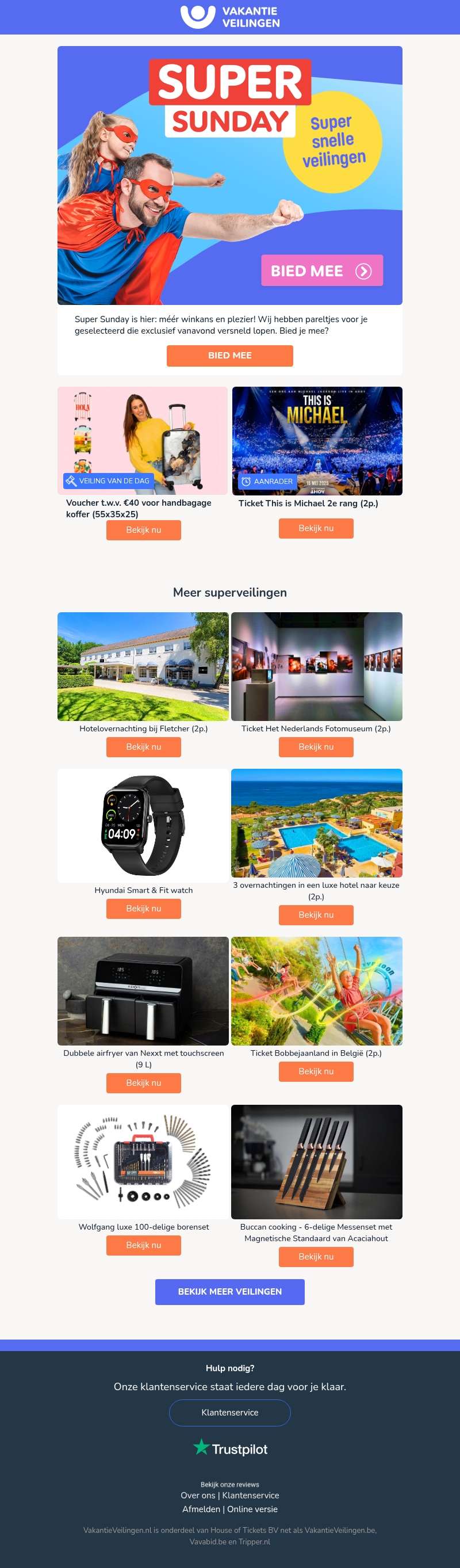 Super Sunday biedt méér winkans en plezier! Profiteer van exclusieve pareltjes die alleen vandaag in versneld tempo lopen. Mis de kans niet om geweldige deals te scoren, van concerttickets tot luxe hotelovernachtingen. Doe mee en ontdek wat er allemaal te winnen valt. Bied nu mee met Super Sunday voor een unieke ervaring!
