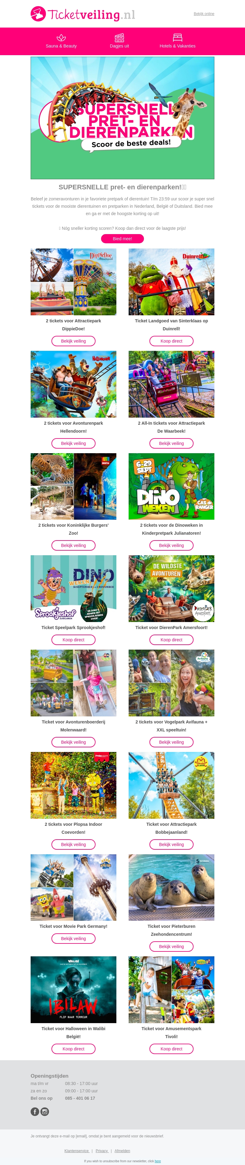 Beleef je zomervakantie in je favoriete pretpark of dierenpark! Scoor supersnel tickets voor de mooiste dieren- en pretparken in Nederland, België of Duitsland. Mis deze kans niet en geniet van de laagste kortingen bij Ticketveiling.nl. Boek vandaag nog je tickets en bereid je voor op een dag vol plezier!