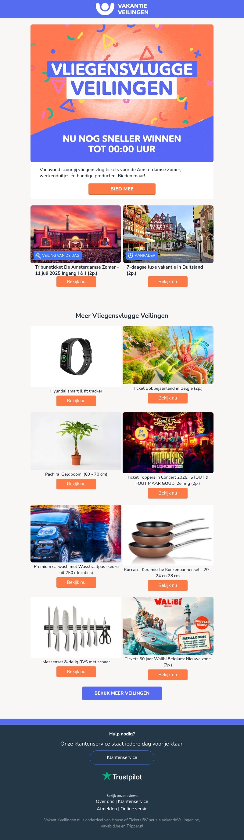 Beleef de magie van De Amsterdamse Zomer met onze vliegensvlugge veilingen. Scoor tickets, weekendjes weg en meer - allemaal met geweldige deals! Bied mee tot middernacht en ontdek ons gevarieerde aanbod. Van muziekfestivals tot avontuurlijke uitstapjes, er is voor ieder wat wils.