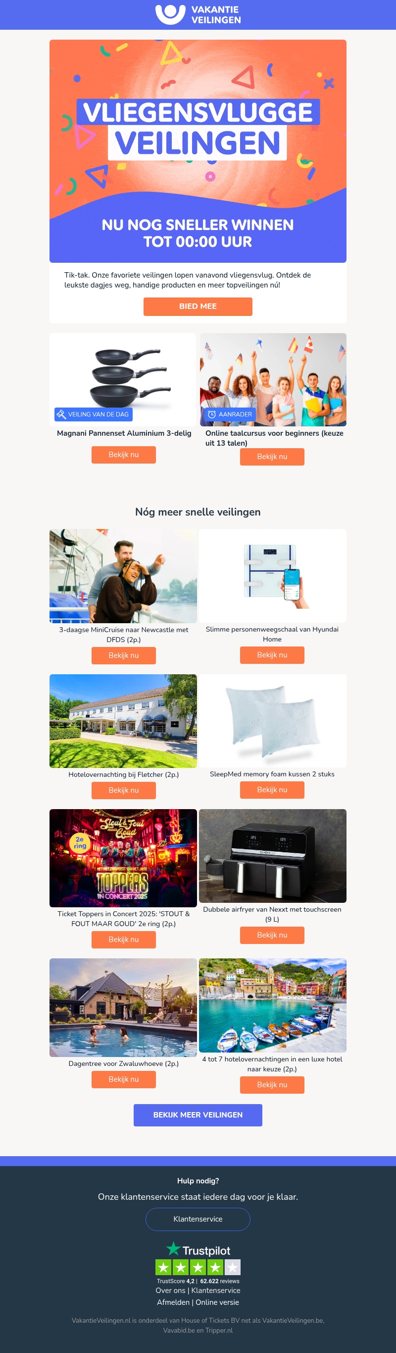 De Vliegensvlugge Veilingen zijn gestart! Pak nu je kans om mee te bieden op fantastische producten en ervaringen. Van een 3-daagse minicruise tot aan luxe hotelovernachtingen, er is voor ieder wat wils. Doe mee voor middernacht en maak kans op unieke deals.