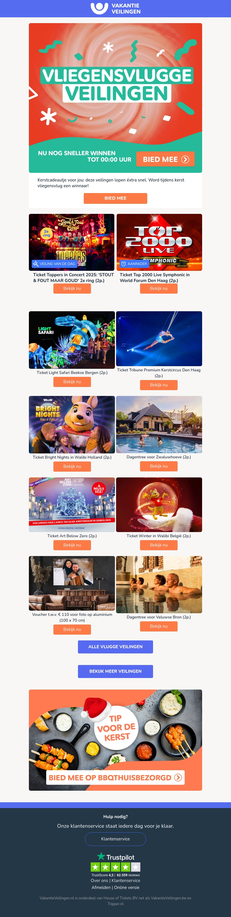 Vakantie Veilingen presenteert spannende kerstveilingen! Grijp je kans om snel en voordelig unieke items te bemachtigen. Ontdek een divers aanbod van concerttickets en avontuurlijke uitjes. Mis deze kans niet om kerst verrassend te maken. Bied mee tot 00.00 uur!