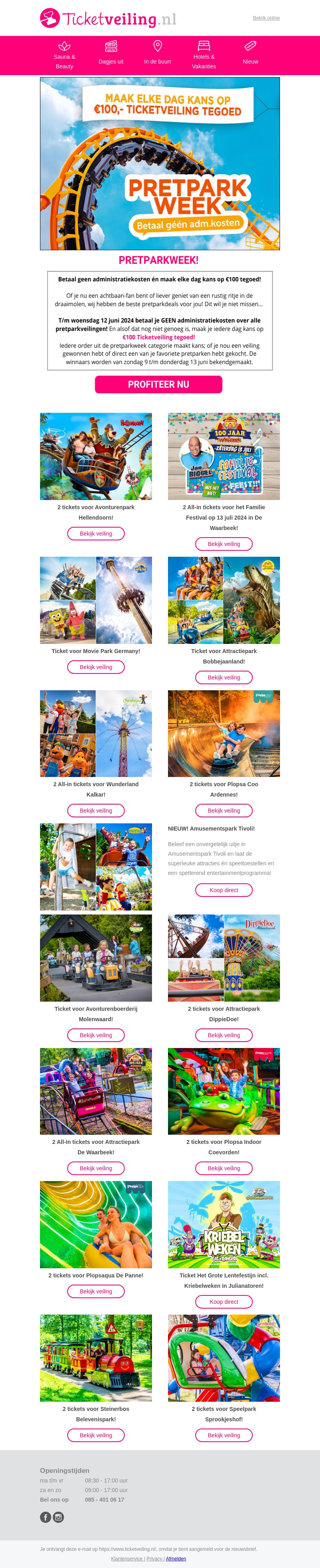 Tijdens de Pretparkweek betaal je geen administratiekosten bij Ticketveiling.nl. Maak elke dag kans op €100 tegoed. Bezoek de beste pretparken zonder extra kosten. Met vele tickets en arrangementen beschikbaar. Profiteer nu van deze geweldige aanbiedingen!