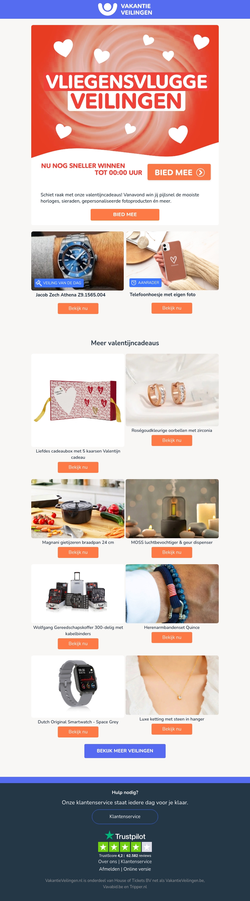 Verwen je geliefde met exclusieve Valentijnsdagcadeaus zoals horloges, sieraden, en gepersonaliseerde items. Mis deze kans niet om de meest bijzondere geschenken te bemachtigen. Vanavond maak je kans op geweldige deals via onze vliegensvlugge veilingen. Of je nu op zoek bent naar een elegant stuk of een verrassend gadget, we hebben het allemaal. Bekijk onze aanbevelingen en maak Valentijnsdag onvergetelijk. Ga snel naar VakantieVeilingen.nl en bied mee!