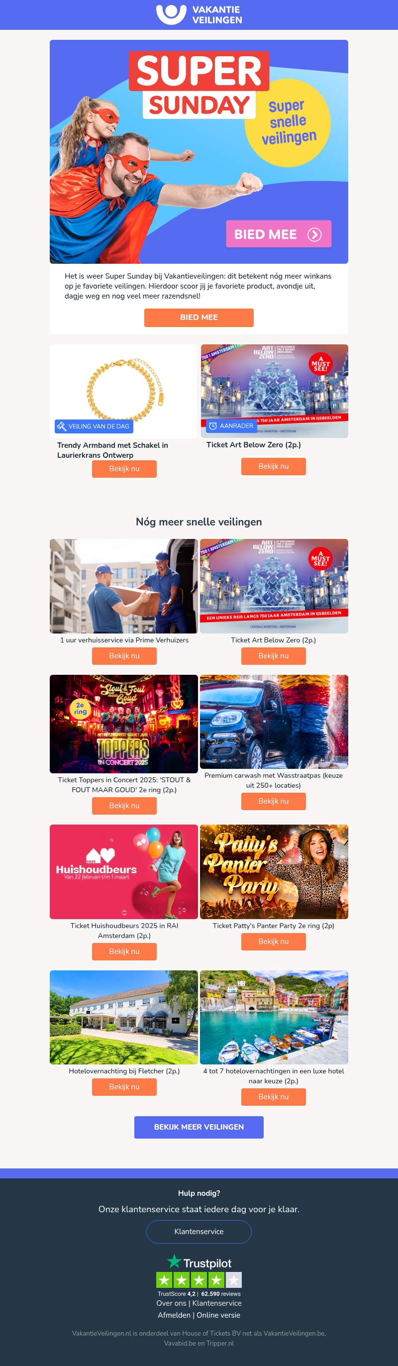 Het is weer Super Sunday bij Vakantieveilingen. Dit betekent nóg meer kansen om je favoriete veilingen te winnen. Scoor jouw favoriete product, avondje uit, of dagje weg supersnel. Van trendy armbanden tot tickets voor concerten en hotelovernachtingen, er is voor ieder wat wils. Mis deze razendsnelle deals niet en bied mee voor de beste prijzen. Klik direct op 'Bied Mee'.