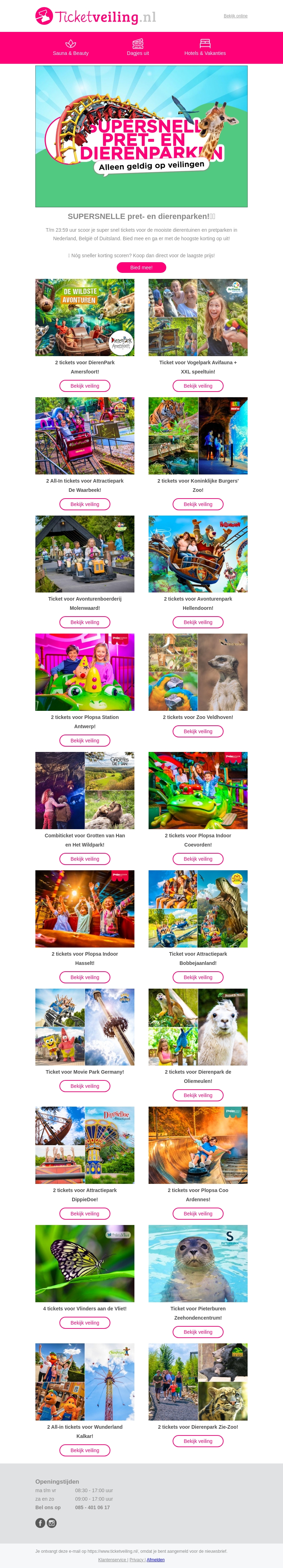 Bezoek de mooiste pretparken en dierenparken met de nieuwste ticketaanbiedingen! Van themaparken zoals Movie Park Germany tot dierentuinen zoals DierenPark Amersfoort, er is voor ieder wat wils. Mis de deals niet en bied mee voor de laagste prijs.