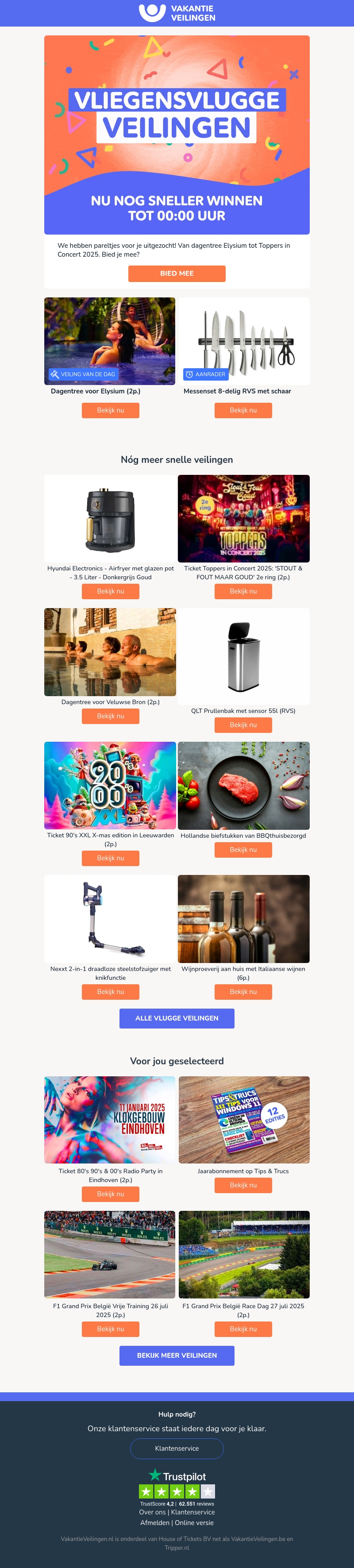 Beleef de spanning met onze snelle veilingen, van dagentree Elysium tot bijzondere concerttickets. Doe mee en grijp je kans om fantastische prijzen te winnen. Mis het niet, bied nu!