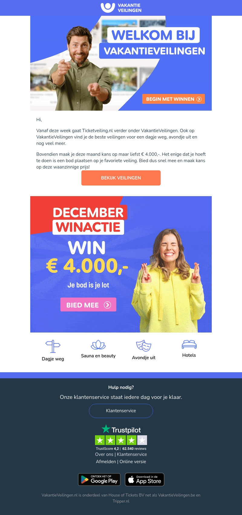 Vanaf deze week gaat Ticketveiling.nl verder als VakantieVeilingen. Hier vind je de beste veilingen voor een dagje weg, avondje uit en veel meer. Deze maand maak je kans op €4.000,- door mee te bieden op je favoriete veiling.